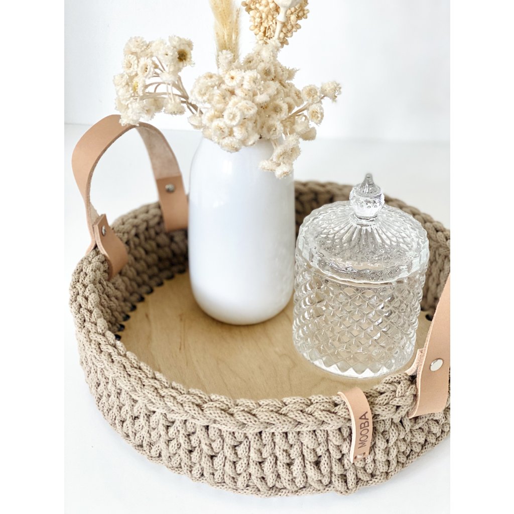 Háčkovaný podnos o průměru 26 cm má dřevěné dno z překližky.